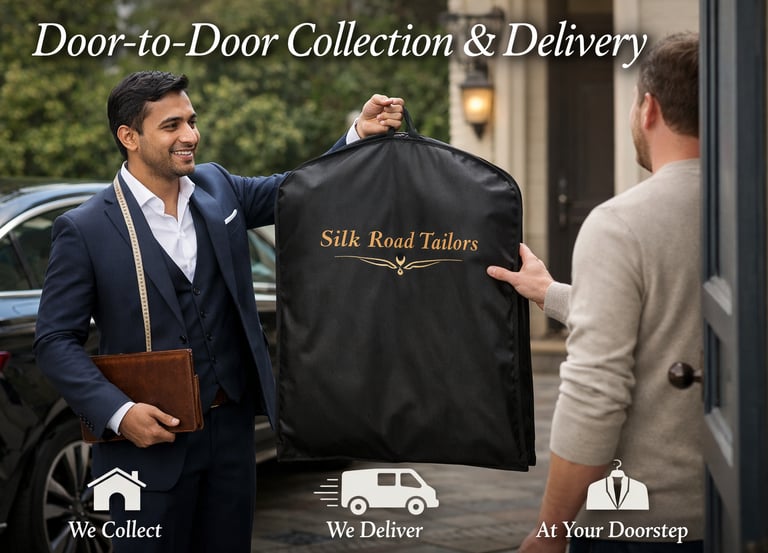 For your convenience, Silk Road Tailors offers a seamless garment collection and delivery service. We ensure secure handling, timely service, and careful return of your tailored garments, allowing you to enjoy a premium tailoring experience without disrupting your schedule. Our door-to-door service is designed to provide comfort, reliability, and complete peace of mind.